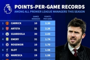 本赛季英超主帅场均积分排名:卡里克2.3分居首,阿尔特塔次席