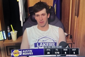 本场比赛,里夫斯出战40分钟13投7中,三分7中4、罚球11中8贡献26分8篮板5助攻1抢断,正负值+26最高。