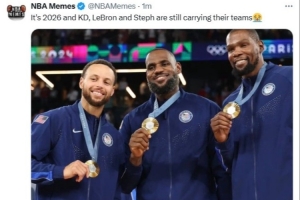 美媒NBA Memes晒出詹杜库在巴黎奥运会的合照,配文写道:“如今已是2026年,KD、詹姆斯和库里依然在独自扛着各自的球队前行。”