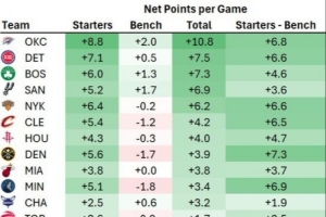 体育资讯3月17日讯 今天,数据分析师Dean Oliver统计了本赛季联盟各队首发阵容和替补阵容的净效率(百回合净胜分)。